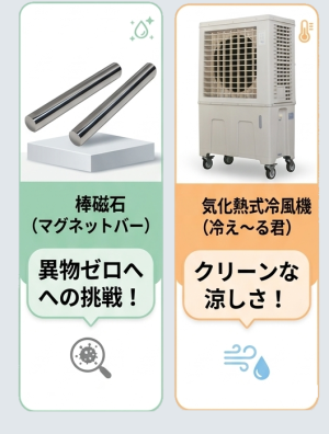 気化熱式冷風機:「排熱ストレス・高額な電気代・給水の手間」の3つを解消し、『クリーンで低コストな涼しさ』を現場にもたらします。 マグネット応用機器:業界トップクラスの強力磁力で、微細なステンレス粉まで除去し製品純度を極限まで高めます。粉だまりを防ぐ三角形型や非接触で吸着する角形など、現場の課題に即した形状で生産性を維持しつつ、HACCP等の厳しい品質基準も容易にクリア可能です。