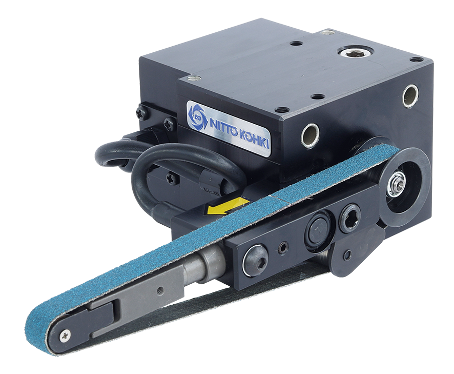 自動機・ロボット搭載向けの空気式ベルト研磨工具。ベルト幅10mmで狭部・細部研磨に対応し、オフセットブラケットによりR面研磨も可能。無負荷回転速度15,000回転/分、ベルト速度990m/分、本体質量0.9kgの軽量設計で、高精度かつ安定した研磨を実現します。