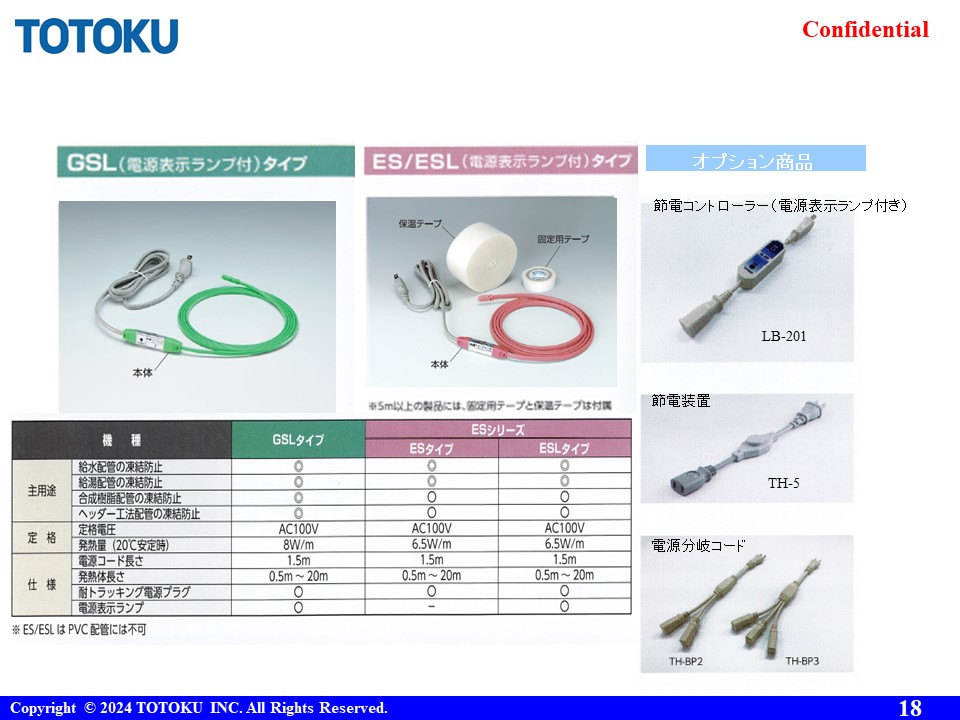 自己温度制御型でありサーモスタット不要で長寿命、急な冷え込みでも、すぐに温めて安心。またGSLタイプは簡単、容易に施工が可能であり、さや管ヘッダー広報システム配管に最適。