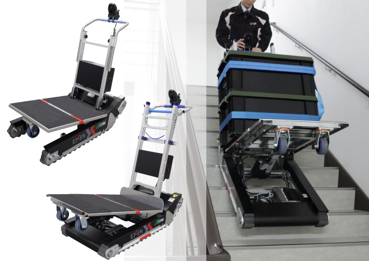 荷物を積載した状態で最大傾斜35度までの傾斜・階段が登板可能なバッテリー式運搬台車です。最大積載荷重は、200kg(SP200)と350kg(SP350)の2機種を用意。オートレベリング機能搭載により、傾斜地でも自動で荷台を水平に維持するため積載物の傾きを防ぎます。 本体操作は、有線コントローラーで行い、電源はリチウムイオンバッテリーとなります。 平地では、一般的な台車としての使用が可能です。
