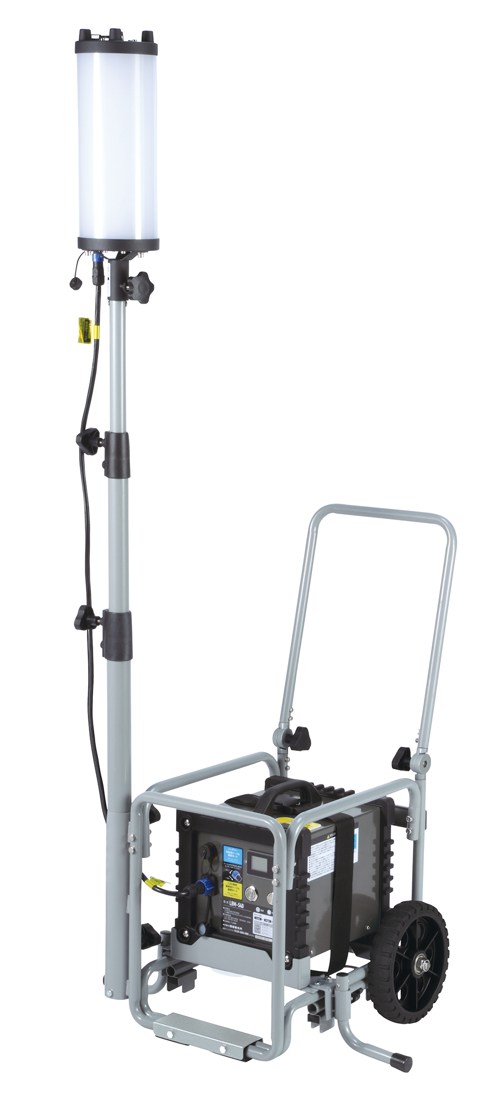 60W型LED。全光束ターボ時で8000ルーメン、点灯時間約9時間(充電時間7.5時間)。発火・爆発が起こりにくいリン酸鉄リチウムイオン電池。重量19.8kgでキャスター付で移動も簡単。