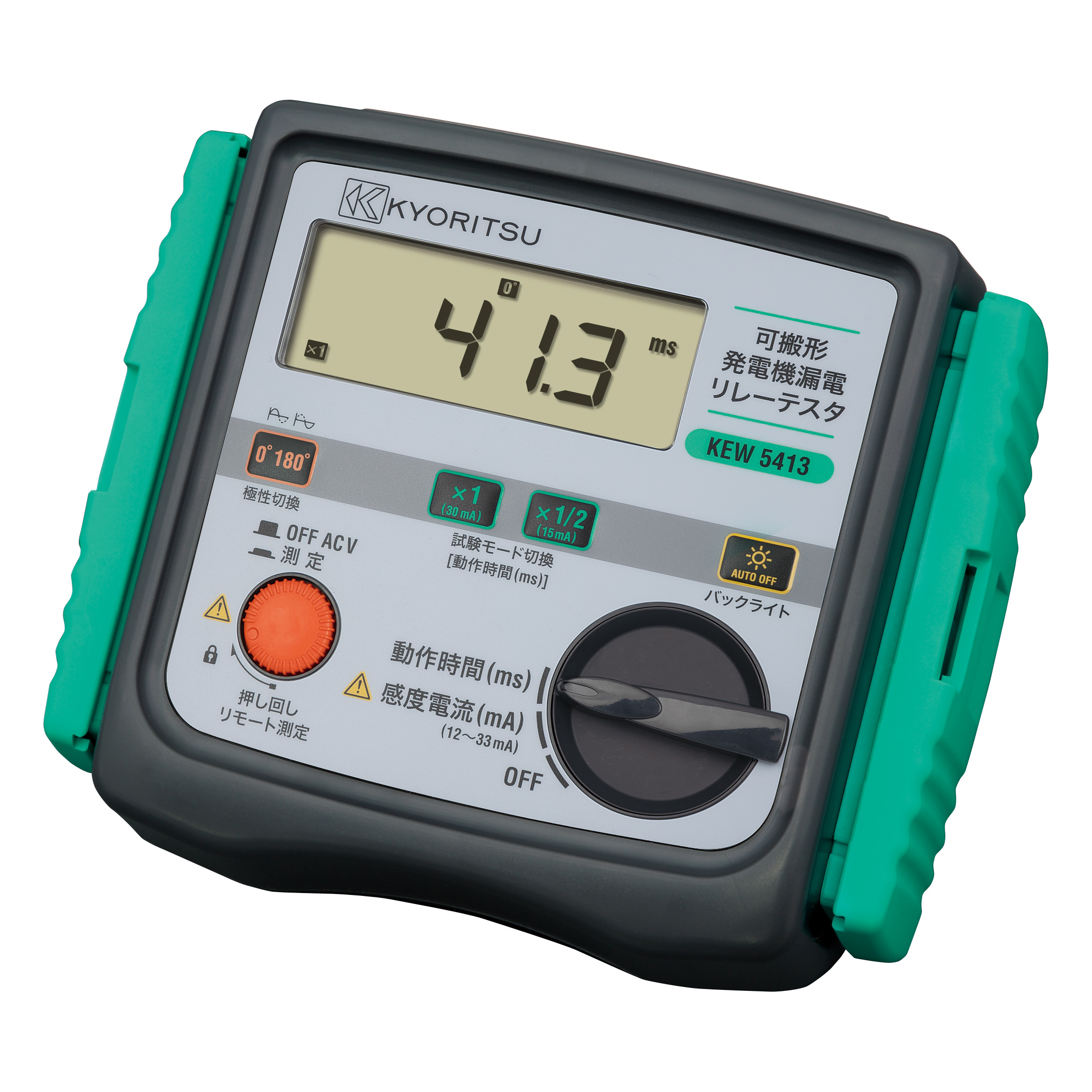 可搬型発電機に搭載されている定格感度電流30mAの漏電リレーについて、動作時間及び感度電流値の測定を行うテスタです。またシステム電圧を測定するための電圧計も備えています。