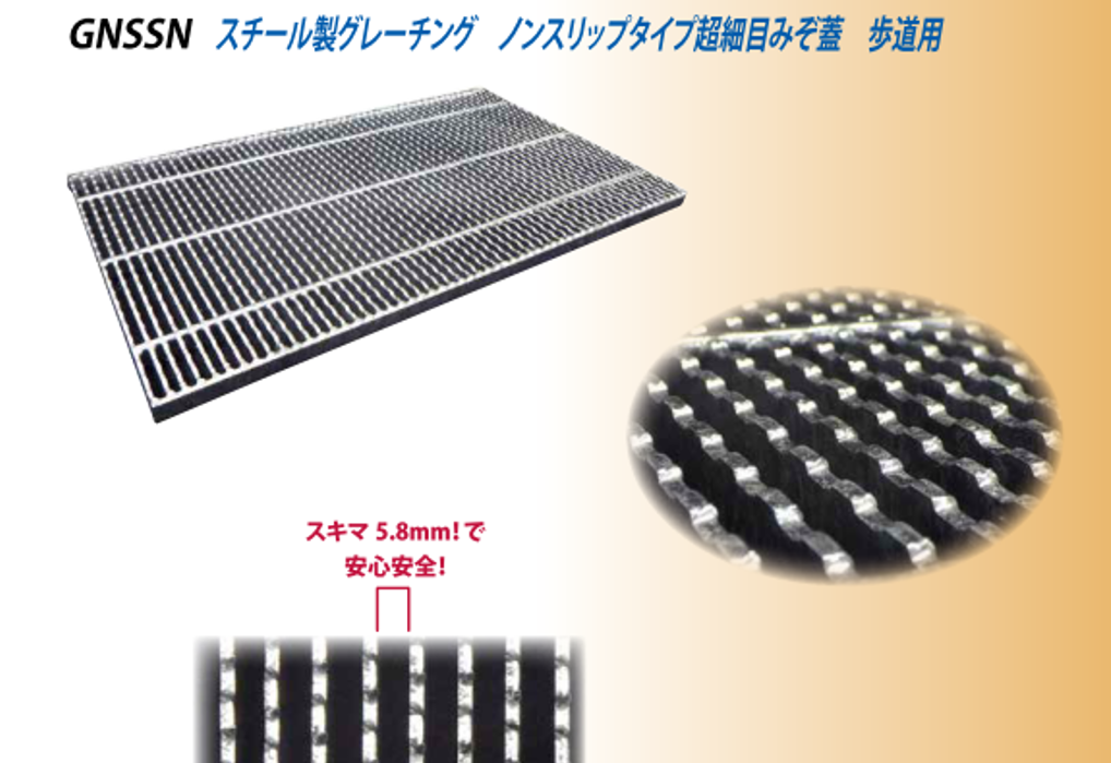 従来の9.5mmから5.8mmへ約40%細くした超細目スキマにより、ヒール・車いす・ベビーカーなどが挟まりにくく、歩行者の安全性が大幅に向上します。「歩行者·車いす·ベビーカーなどが安全でスムーズに通行できるユニバーサルデザインです」。ノンスリップ仕様で滑りにくい製品となります。