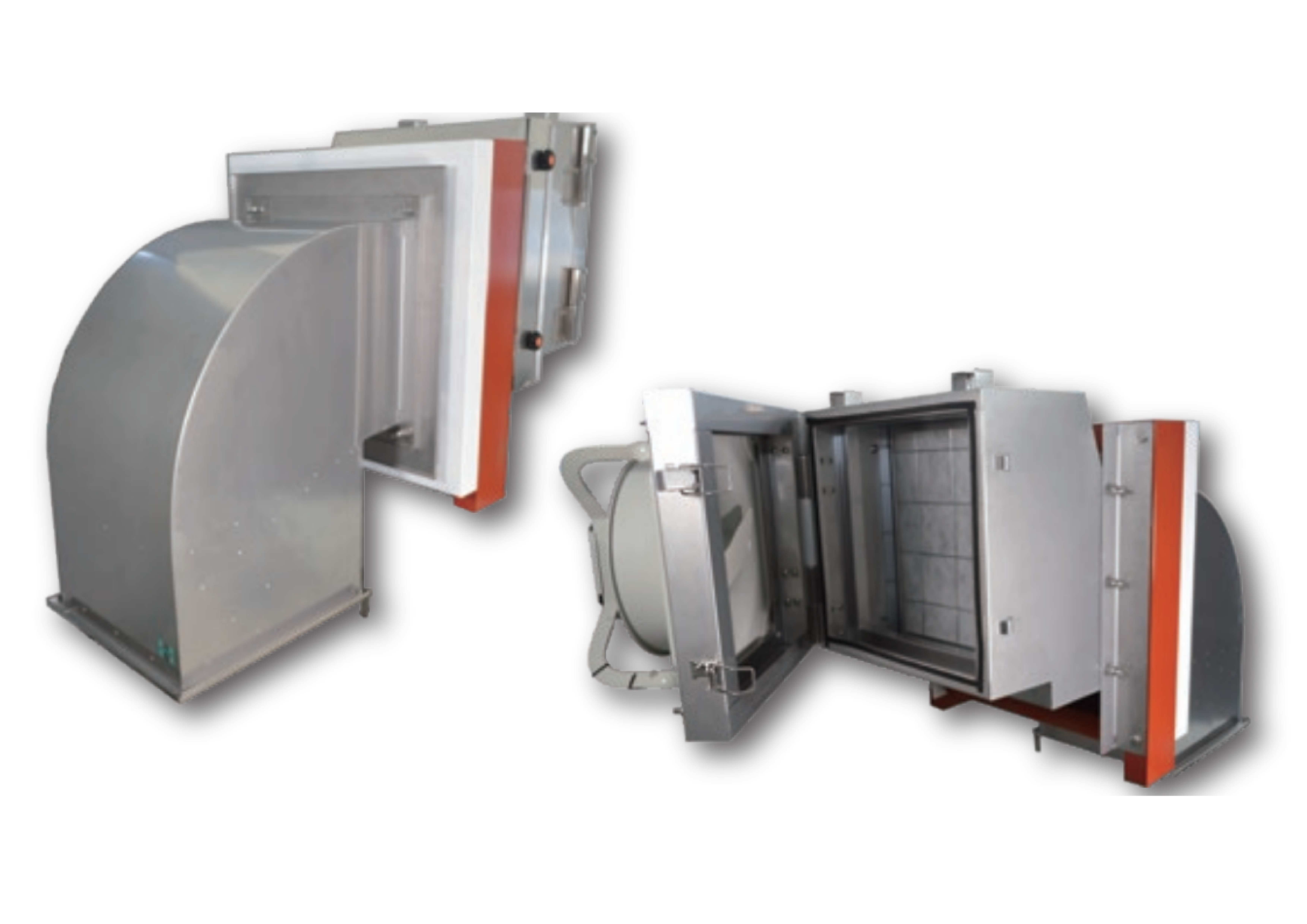 「有圧扇取付枠(有圧換気扇用枠)」とは、工場や倉庫などの外壁にウェザーカバー、屋内側に有圧換気扇を設置する際に、壁と有圧換気扇を確実に固定し、安定させるためのスリーブ枠です。有圧換気扇側をキャッチクリップ式の点検窓(扉)にし、開閉が可能になり取付枠、ウェザーカバー内部を屋内側から点検が可能です。フィルター内臓で溶接一体型のため、現場での組立が不要になり、勾配や段差を付けることで漏水のリスクを削減しました。