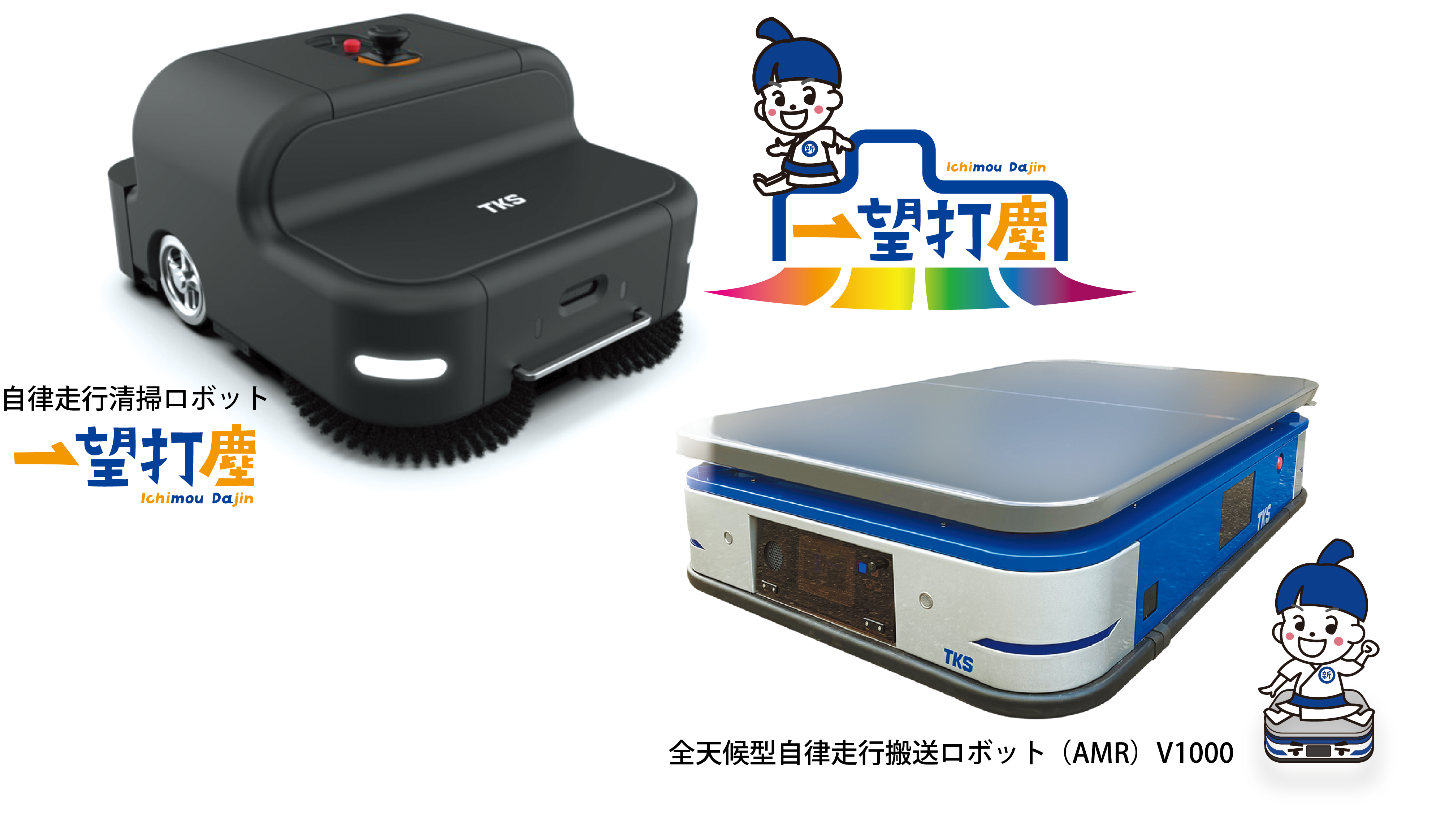 全天候型自律走行搬送ロボット(V1000)は、1tまでの荷物を自動的に目的の場所へ運び、屋外の悪路でも使える全天候型のAMRとなります。お客様のニーズに合わせたカスタマイズも行っております。2tタイプもございます。自律走行清掃ロボット(一望打塵)は、多様なゴミを自動で収集します。粉塵が舞う環境下でもご使用が可能です。操作はタブレット端末を使用し、簡単な操作でご使用が可能です。